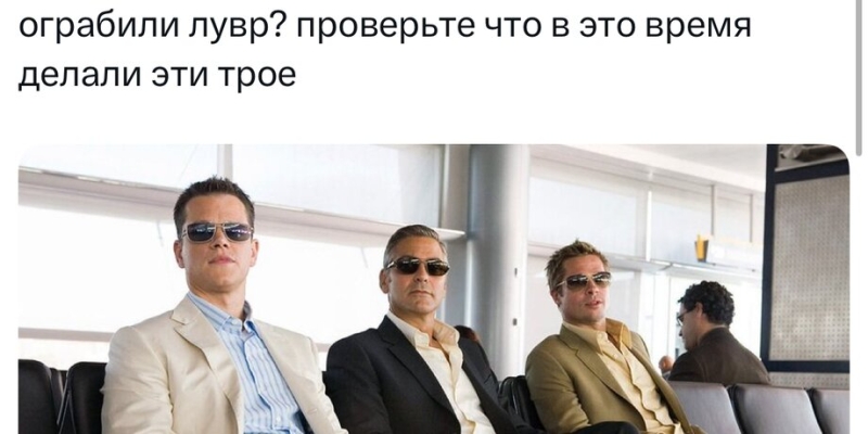В свою очередь, в Сети появились многочисленные мемы на тему ограбления одного из старейших и крупнейших музеев мира. Часть из них связана с сюжетом кинотрилогии про друзей Оушена, главные герои которой совершают дерзкие кражи. Автор одного из мемов предлагает проверить, где в момент инцидента в Лувре находились Джордж Клуни, Брэд Питт и Мэтт Деймон, делая отсылку к их персонажам-грабителям в фильмах.