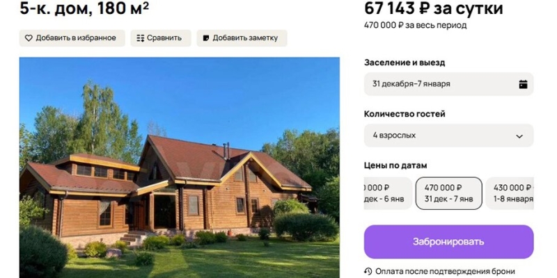 Например, в деревне под Рузой предлагают снять двухкомнатную избу максимум на пять гостей площадью 65 квадратных метров. Внутри есть минимальные удобства вроде плиты, холодильника, стиральной машины и телевизора. В период с 31 декабря по 7 января это обойдется примерно в 120 тысяч рублей, а, например, с 3 по 10 января – уже 98 тысяч. При этом, если снять избу в праздники на одну ночь, придется отдельно оплатить клининг – 2 тысячи. Также на территории расположена баня с дровяной печью, которую можно затопить самостоятельно, однако в период новогодних праздников это обойдется в 6 тысяч с человека. Доплатить придется и в случае, если приехать с животными, – 1 тысяча в день.