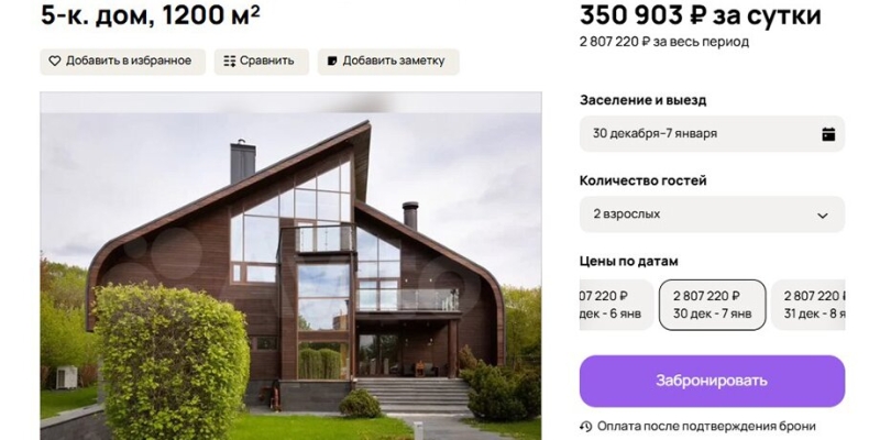 При этом полмиллиона рублей в будущие праздники не предел. Например, в одном из элитных поселков недалеко от Мытищ предлагается снять пятикомнатный двухэтажный дом площадью 1 200 квадратных метров, который обойдется с 31 декабря по 7 января чуть более чем в 2,8 миллиона рублей. В данном случае лимит на количество гостей равен 25 (если больше – придется доплачивать), но при этом можно устраивать вечеринки.